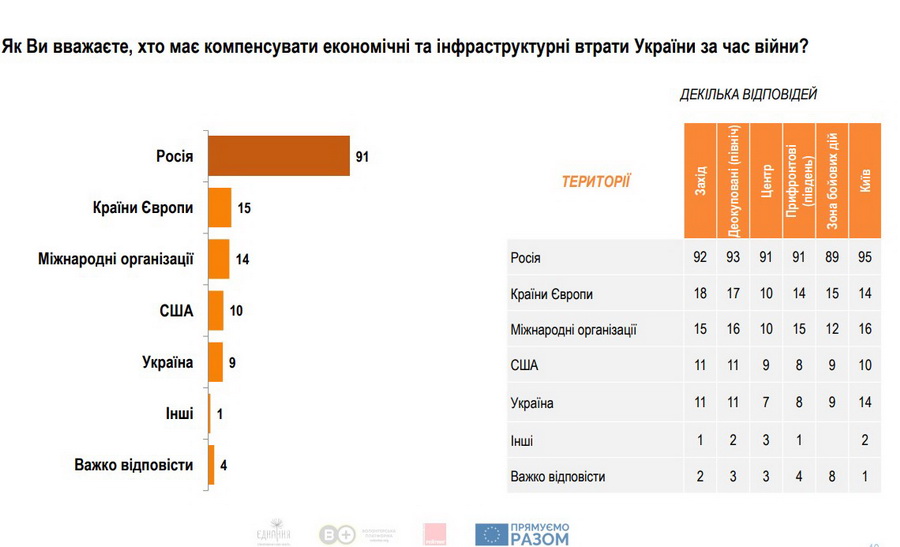 Більше 90% вважають, що росія має компенсувати економічні та інфраструктурні втрати України за час війни. При цьому вірять в це лише третина опитаних. Компенсацій від країн Європи та міжнародних організацій очікують 14-15%, від США – 10%, від України – 9%. Вірять в можливість її реалізації від цих країн більше 70%.