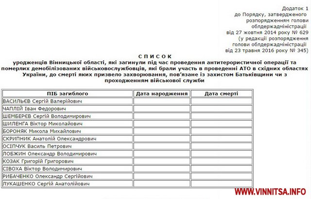 В облдержадміністрації затвердили список загиблих, померлих демобілізованих військовослужбовців та осіб, які отримали поранення під час проведення антитерористичної операції в східних областях України, яким призначено одноразову грошову допомогу.