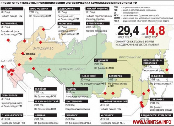 Згідно з проектом будівництва виробничо-логістичних комплексів Міноборони РФ,поряд із Україною до 2017 має бути побудований комплекс у Севастополі, в 2016 році - в селищах Михайлівське, Койсуг, Краснофлотский, в Армавірі і Бутурліновка.