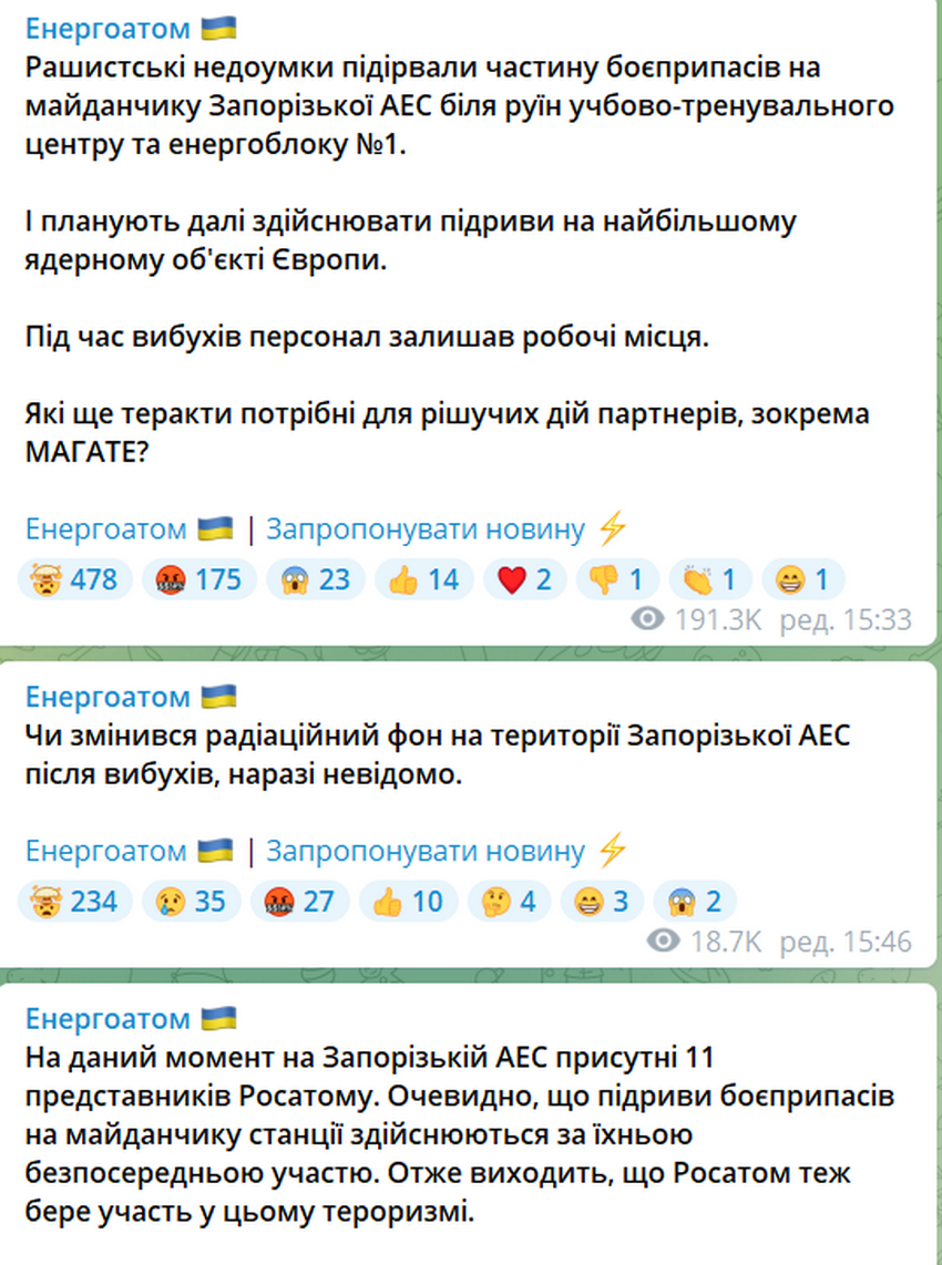 «На даний момент на Запорізькій АЕС присутні 11 представників Росатому. Очевидно, що підриви боєприпасів на майданчику станції здійснюються за їхньою безпосередньою участю. Отже виходить, що Росатом теж бере участь у цьому тероризмі.
