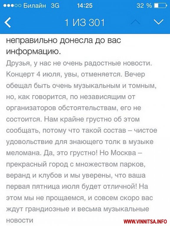 - Друзі. Дві години тому я опублікував інформацію про скасування концерту "Pianoбой" у Москві. Після цього мені написали і подзвонили різні люди. Підсумком наших розмов став висновок: "Я (Олексій Согомонов), не володію офіційною інформацією про скасування концерту "Pianoбой". А отже, мій пост помилковий." Ок, я не буду сперечатися. Ось офіційна відповідь організаторів: "Вечір п'ятниці" скасовано. "Дивіться прикладена фото. Багато в Москві парків, друзі. Багато, - написав Олексій.