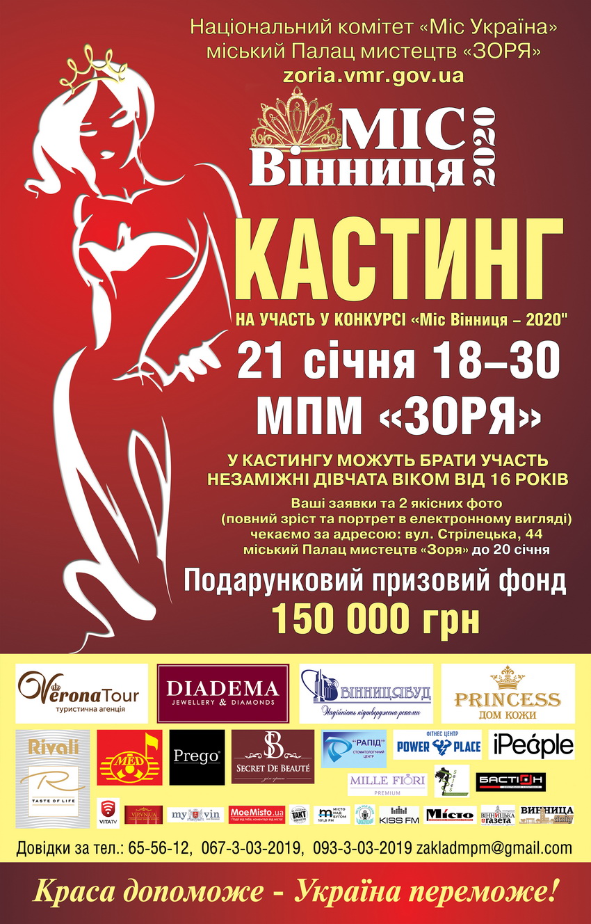 Міський палац мистецтв «Зоря» оголосив про початок кастингу на конкурс «Міс Вінниця 2020». Заявки на участь прийматимуть до 20 січня.