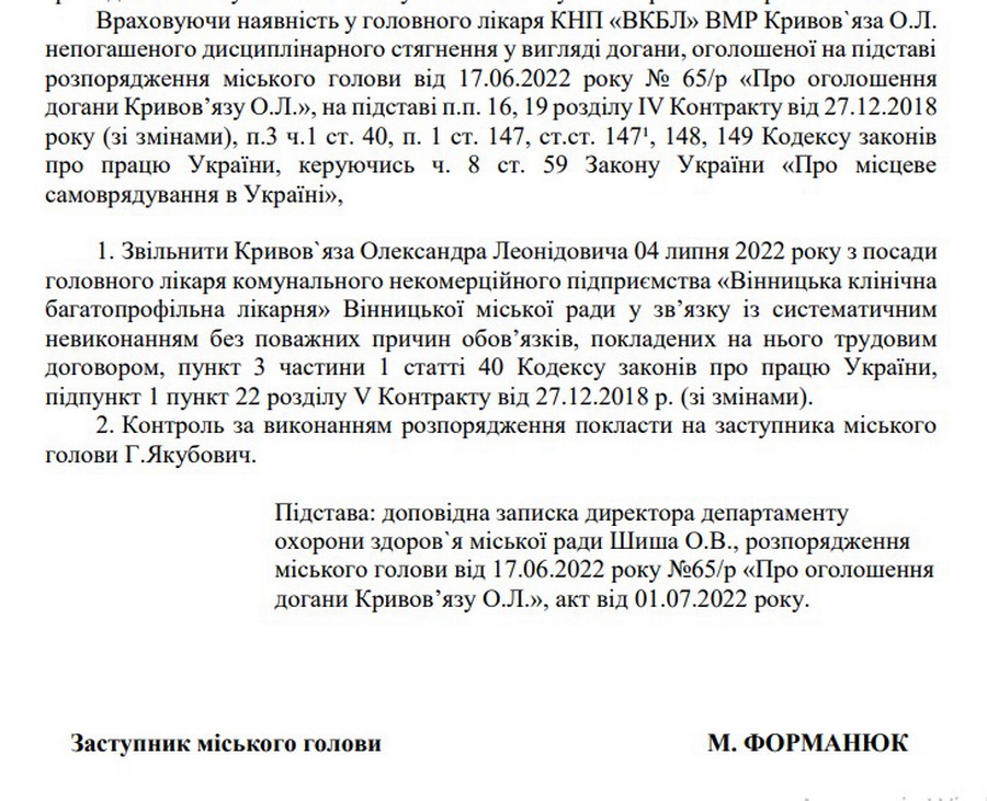На підставі доповідної записки директора департаменту охорони здоров`я міської ради Шиша О.В., розпорядження міського голови від 17.06.2022 року №65/р «Про оголошення догани Кривов’язу О.Л.», Олександра Кривов`яза звільнено з посади головного лікарня 4 липня 2022 року.
