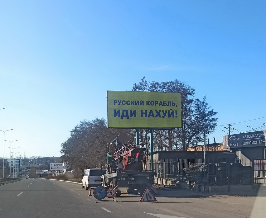 На Вінниччині почали встановлювати біг-борди та друкувати наліпки із трендовими для українців сьогодні гаслами: «Русский корабль иди нах#й!». Один з таких рекламних щитів красномовно знаходиться за поворотом з селища Стрижавка у бік Вінниці.