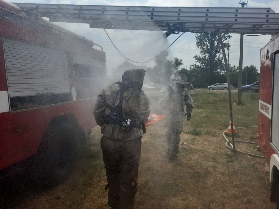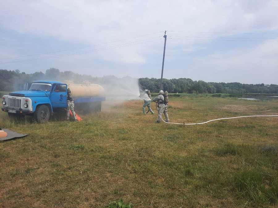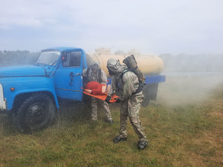 Бійці ДСНСвідпрацювали алгоритм аварійно-рятувальних робіт в умовах хімічного забруднення, рятування постраждалих із зони хімічного забруднення, їх деконтамінаціі та ліквідації аварійної ситуації з небезпечною хімічною речовиною.