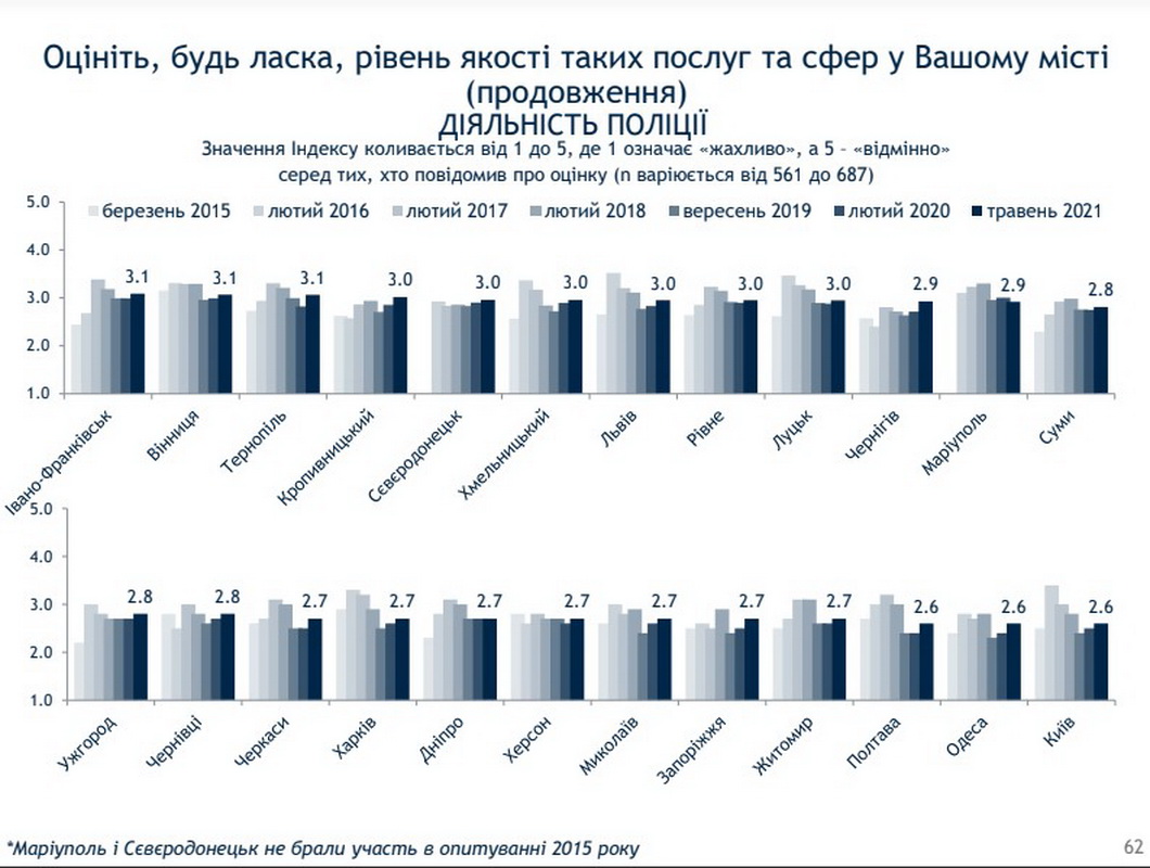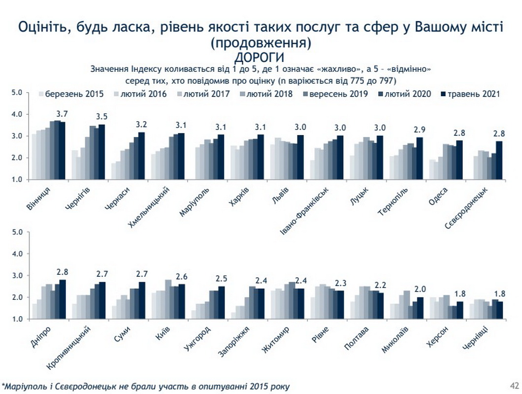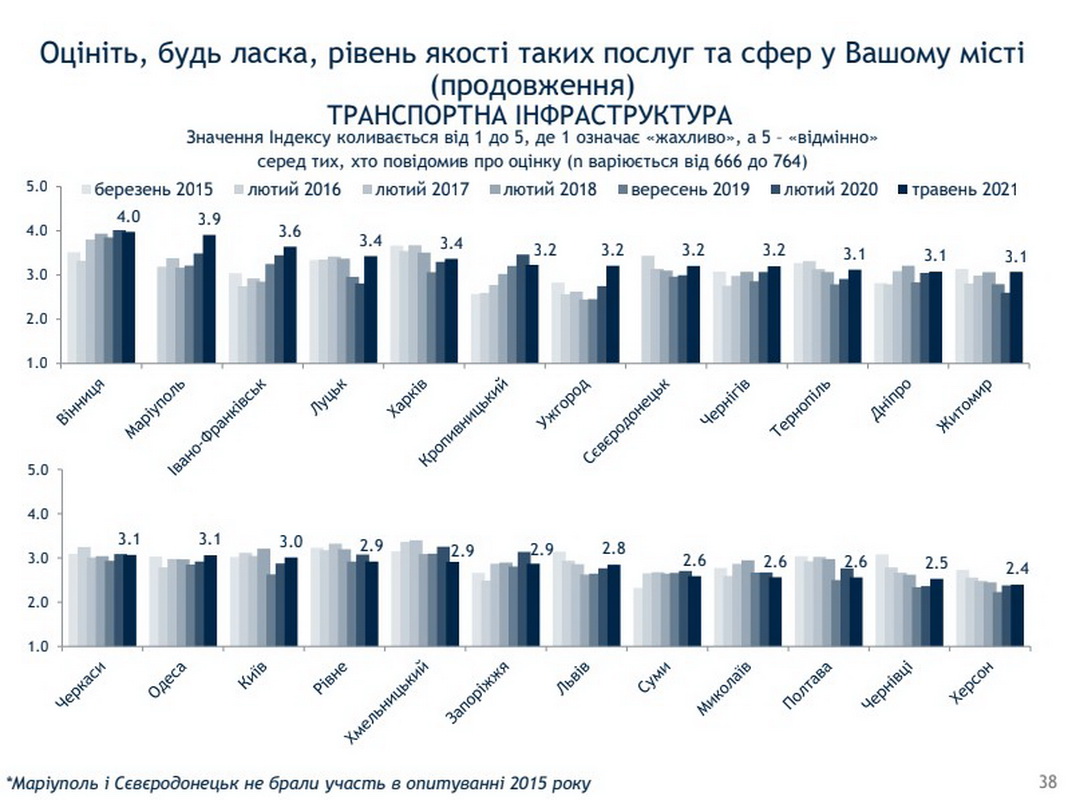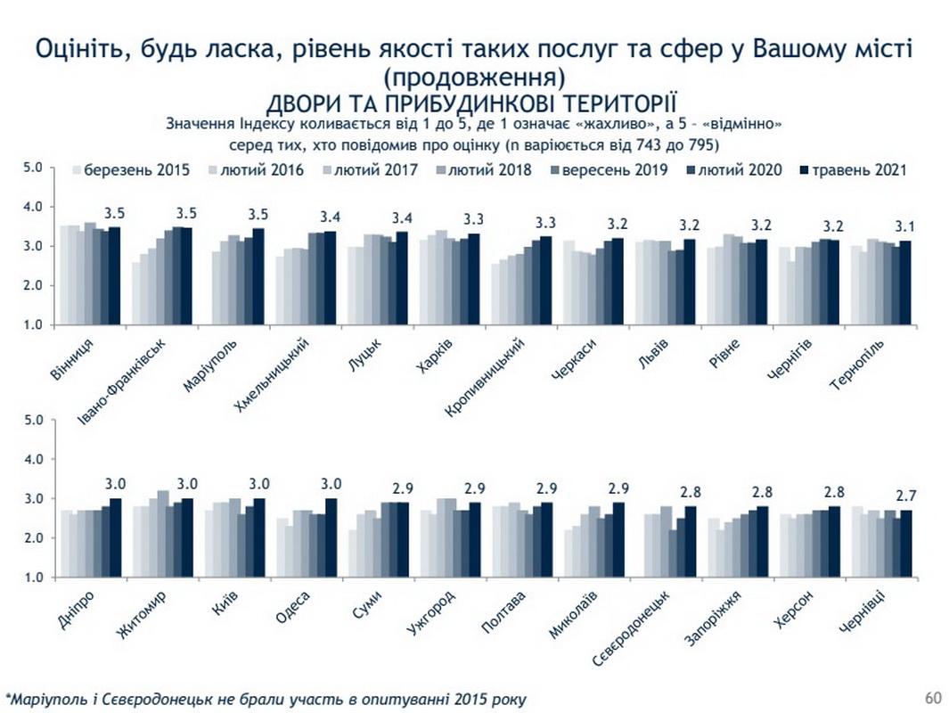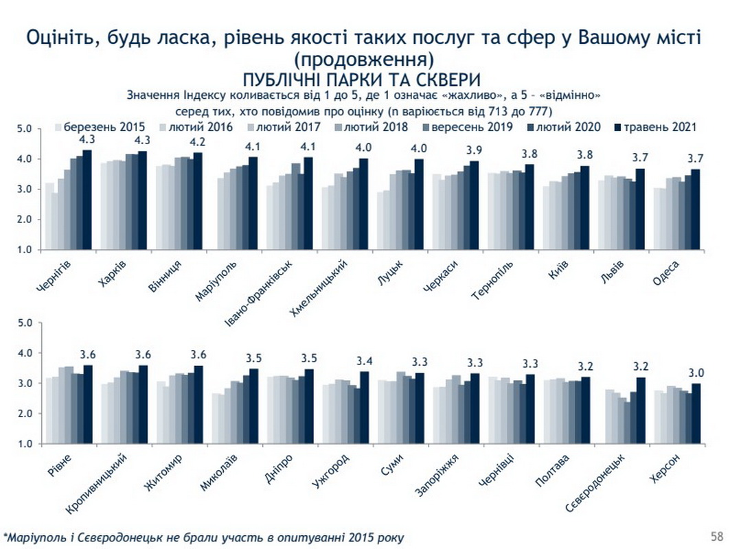 Учасники опитування оцінювали якість послуг у їхньому місті – збір сміття, паркування, тротуари, громадський транспорт, інфраструктуру, дороги, парки та сквери, заклади культури, двори і прибудинкові території, екологію, навколишнє середовище та діяльність поліції.