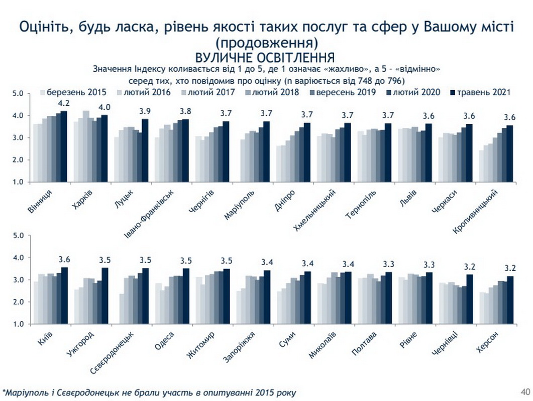 Вуличним освітленням задоволені на 4,2 бали. Загалом 30% опитуваних оцінюють освітлення у місті на «відмінно», 54% на «добре» і лише 1% на «жахливо».