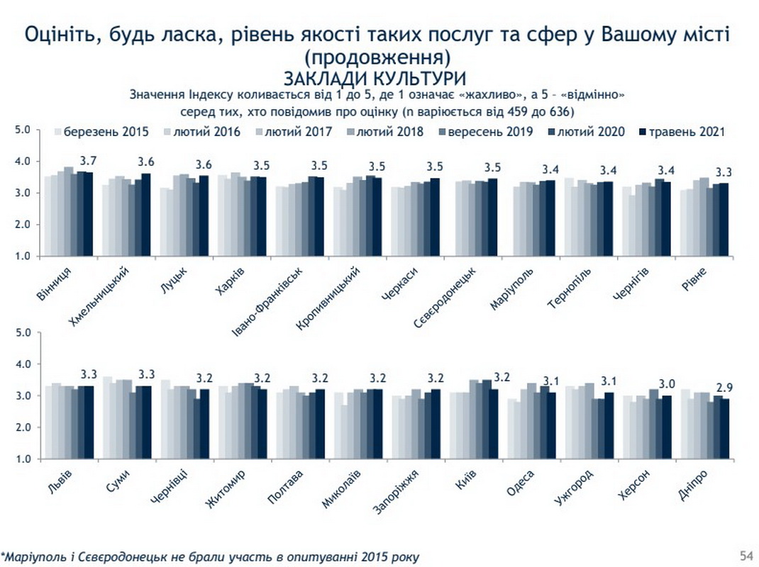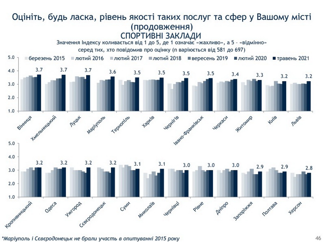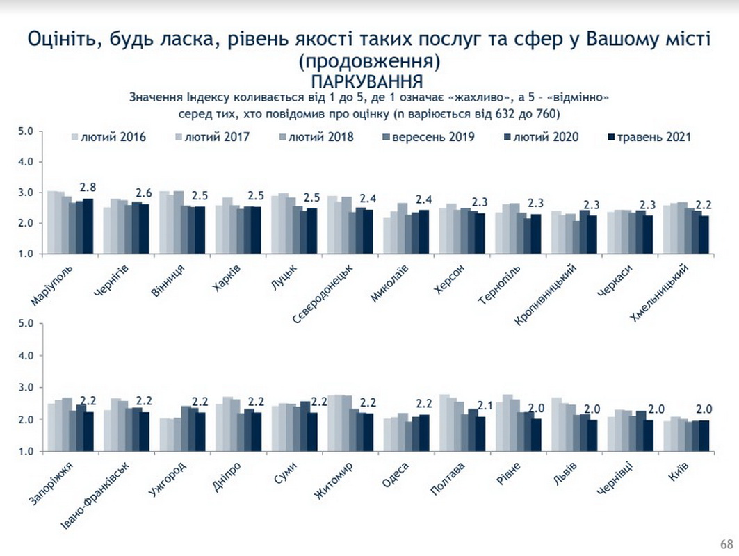 Всі показники оцінювалися за п’ятибальною шкалою: 1 – «жахливо», а 5 – «відмінно». Серед 24 міст України, найбільше послугами задоволені жителі Вінниці, наступні в рейтингу Луцьк, Івано-Франківськ та Хмельницький, а найнижче оцінили якість послуг жителі Херсона.