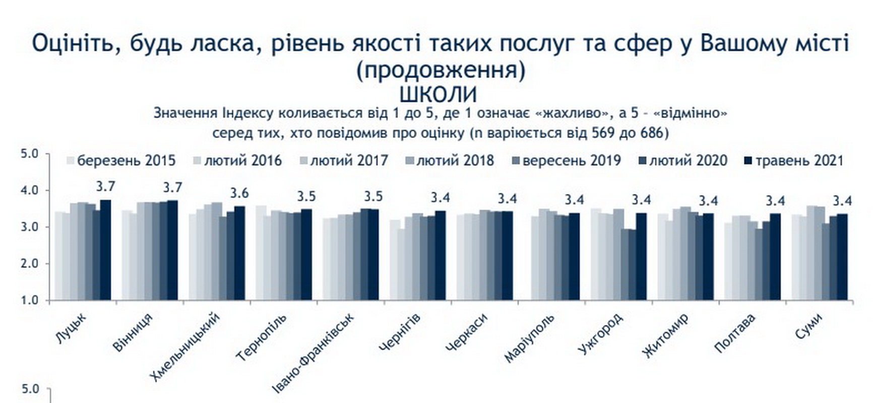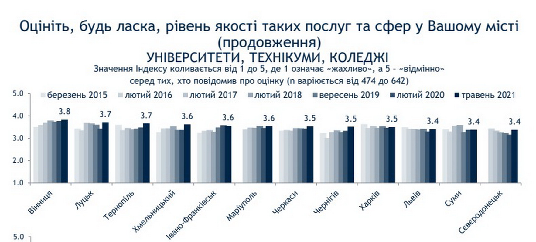 Університети, технікуми та коледжі отримали оцінку 3,8 балів. Школи – 3,7 балів, а дитячі садочки – 3,8 балів.