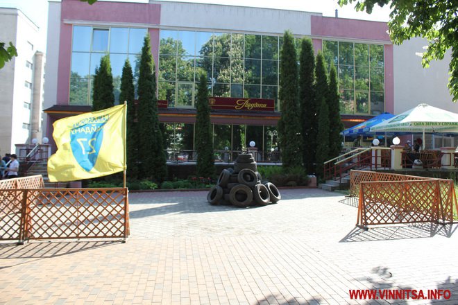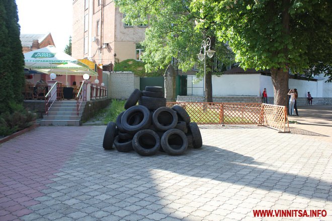 Перед прес-конференцією під стіни готелю активісти принесли шини. Спочатку запевнили, що це лише символ Майдану і його не використовуватимуть, а після – натякнули, що в разі продовження рейдерського захвату шини можуть і горіти.