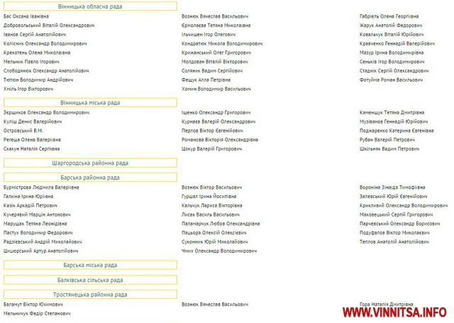 Так, у списку до Вінницької облради – 25 кандидатів, до Вінницької міської ради – 15 кандидатів. У Барську районну раду – 23 кандидати. У Тростянецьку райраду – 4 кандидати, у Козятигнську міськраду – 3. По інших районних та міських радах області списки кандидатів не оприлюднені.