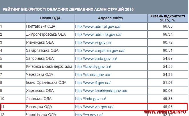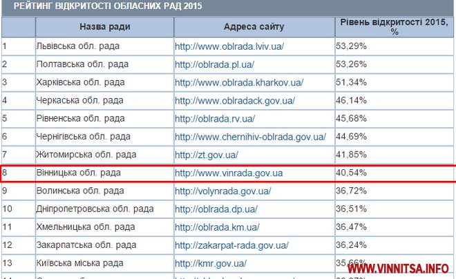 Варто зазначити, що сайтам Вінницької облради та облдержадміністрації до лідерів далеченько. За оцінками дослідження, сайт Вінницької облради займає восьме місце, поступаючись Львову, Черкасам, Харкову, Рівному, Чергігову та Житомиру. А сайт Вінницької облдержадміністрації – на одинадцятій сходинці, поступається Полтаві, Дніпропетрвоську, Рівному, Закарпаттю, Запоріжжю, Київській міській адміністрації, Черкасам, Івано-Франківську, Харкову та Львову.