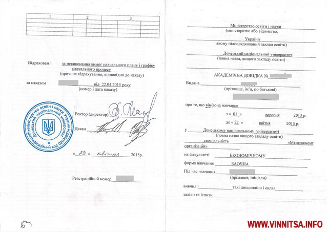 Донецький національний університет наголошує, що академічні довідки та інші документи, які видано пізніше 30 жовтня.2014 р. з відтиском захопленої печатки Донецького національного університету (на дійсних печатках ДонНУ повинно бeти зазначено м. Вінниця), та підписані особами, яких було звільнено з університету у зв’язку з їх співпрацею з окупаційною владою, не є дійсними.