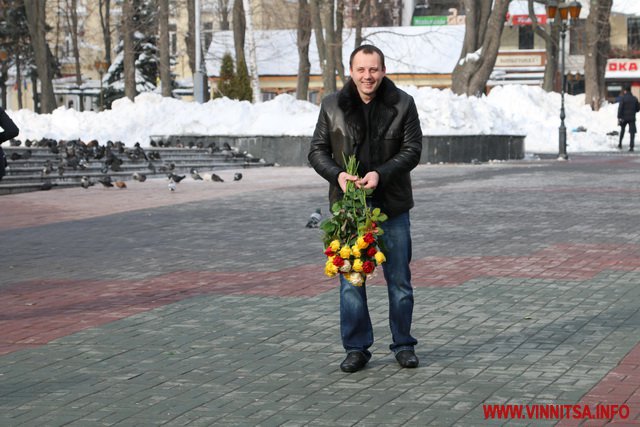 На Соборній Олександр з букетом тюльпанів чекає на дівчину, якій хоче запропонувати зустрічатися.