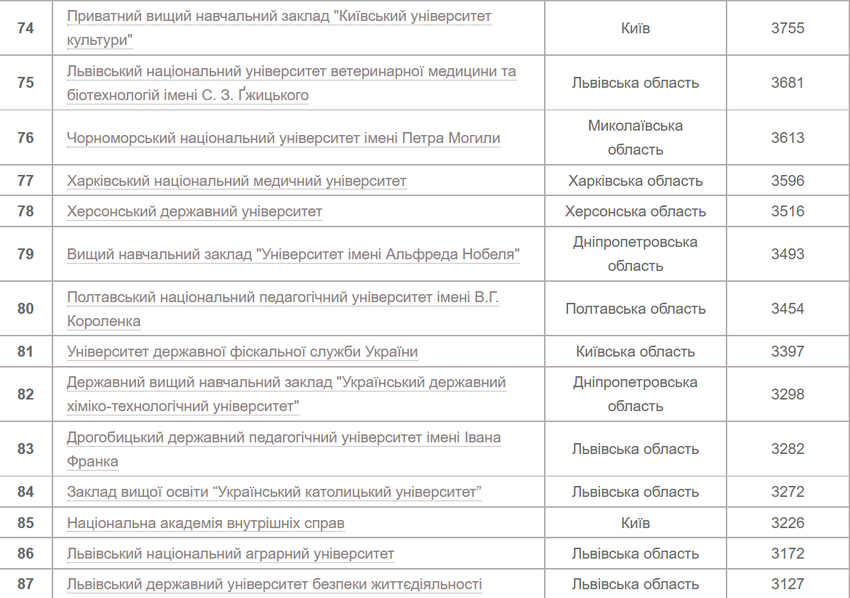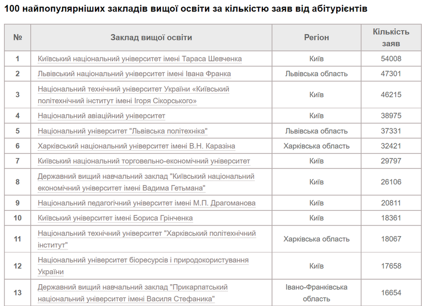 «Як і минулого року, лідерами за кількістю заяв від абітурієнтів, що вступають на основі повної загальної середньої освіти, є Київський національний університет імені Тараса Шевченка та Львівський національний університет імені Івана Франка. Третю сходинку посідає Київський політехнічний інститут імені Ігоря Сікорського. Четверту та п’яту сходинку посідають Національний авіаційний університет та Національний університет «Львівська політехніка», - зазначено в повідомленні.