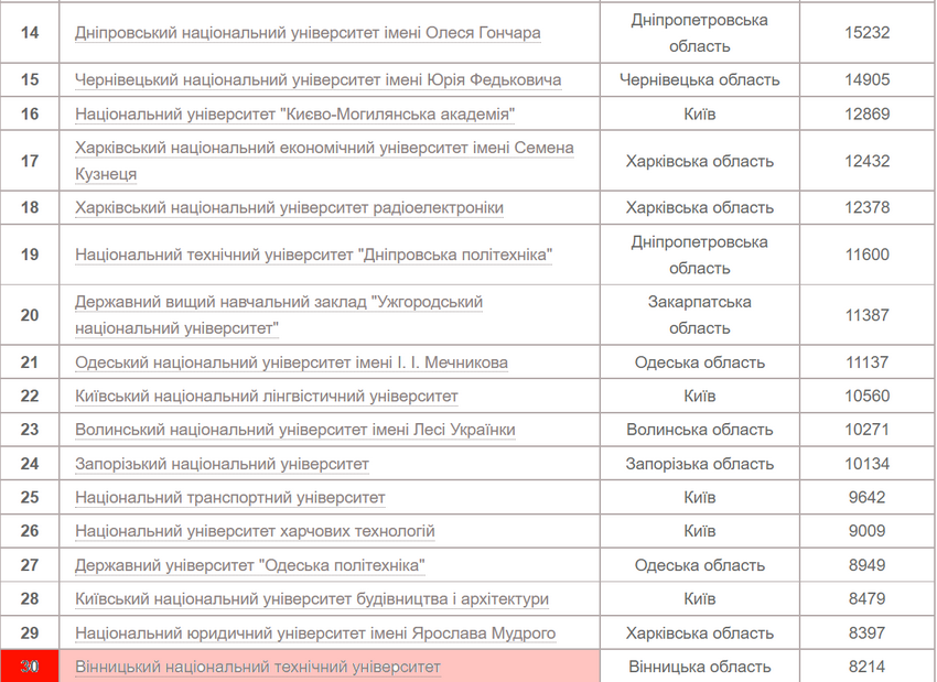 У переліку 100 найпопулярніших закладів вищої освіти за кількістю заяв від абітурієнтів Вінницький національний технічний університет на 30 місці. Подано 8214 заяв.