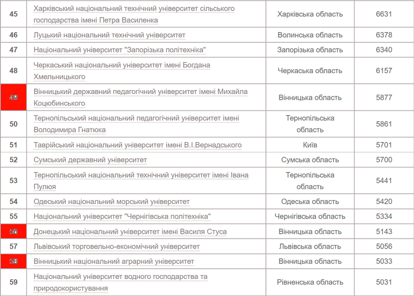 Вінницький державний педагогічний університет імені Михайла Коцюбинського на 49 місці. Подано 5877 заяв.