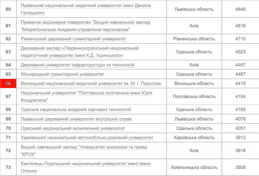 Вінницький національний медичний університет ім. М. І. Пирогова на 66 місці. Подано 4419 заяв