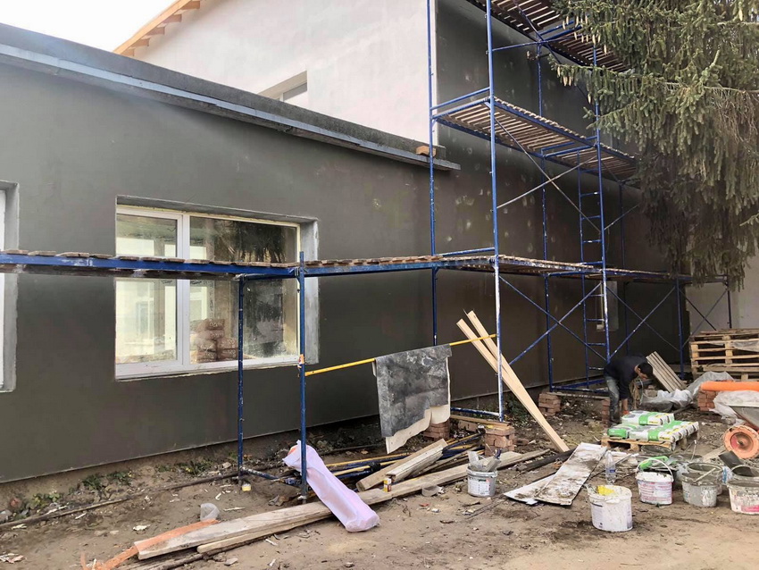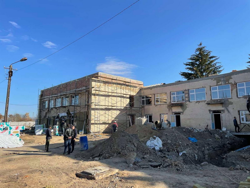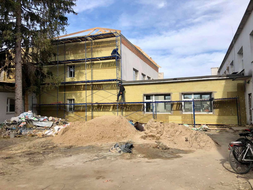Наразі утеплюють, вирівнюють та фарбують поверхні фасаду, штукатурять та шпаклюють стін, влаштовують покрівлі, теплотрасу, зовнішнє та і внутрішнє водопостачання.
