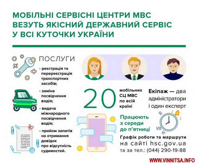 Сервісні центри міністерства внутрішніх справ запровадили нову послугу – мобільний сервісний центр. Фахівці виїжджатимуть у віддалені населені пункти на автомобілях, обладнаних спеціальною технікою. У Вінницькій області визначили три маршрути – Козятин, Жмеринка і Бершадь.