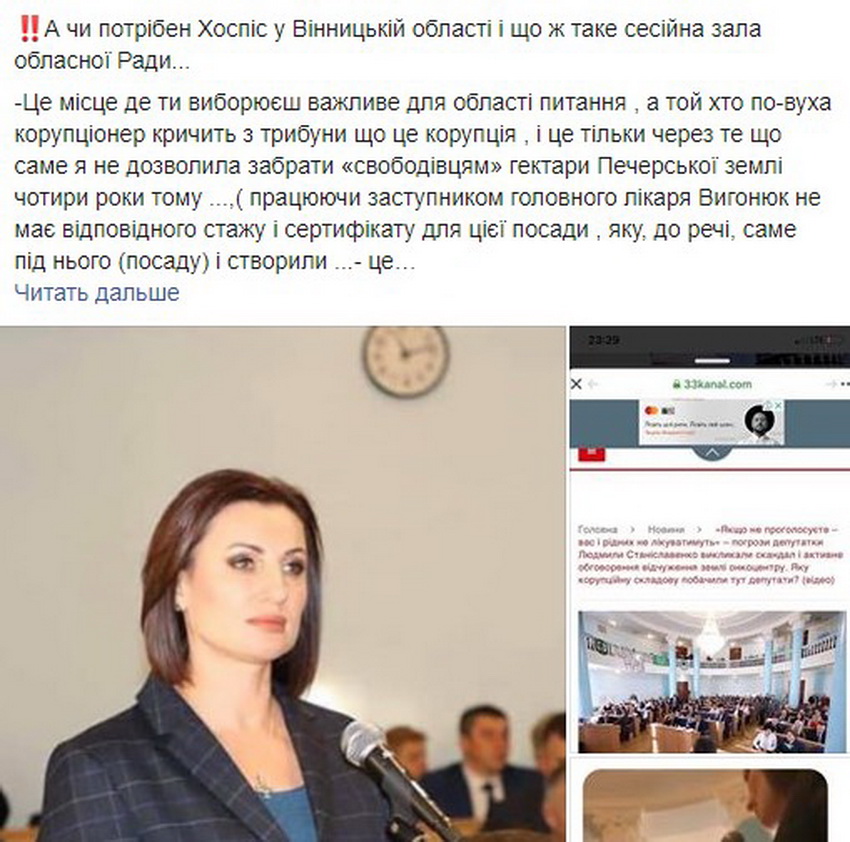 З трьох профільних комісій, до сесії проект рішення не погодила комісія з питань законності і люстрації, головою якої є медик Андрій Вигонюк (ВО Свобода). Члени комісії зазначили, що вбачають в рішенні можливу корупційну складову. На сесії Андрій Вигонюк переконував депутатів не підтримувати проект, через що в залі розгорнулась м’яко кажучи дискусія. Наступного дня в ЗМІ з’явилась публікація зі звинуваченнями на адресу Людмили Станіславенко, припускаючи, що там є її бізнес-інтерес. У відповідь та написала пост про депутатів облради, розписавши детально хто які посади займає і як хто використовував посади для лобіювання власних інтересів.