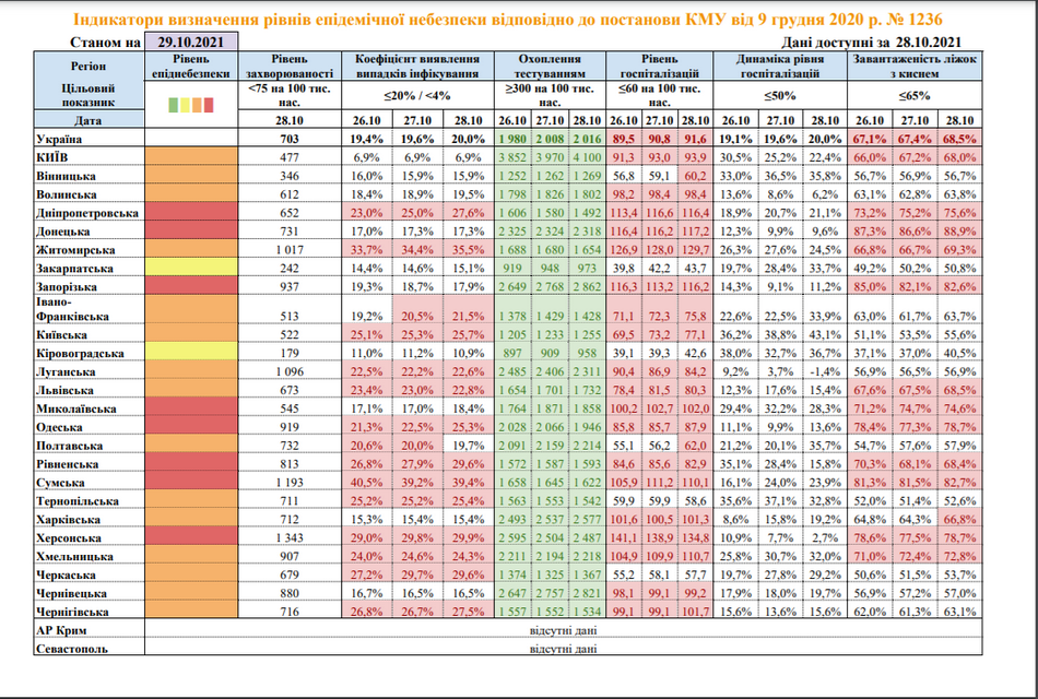 Згідно з індикатором визначення рівнів епідемічної небезпеки, який 29 жовтня оприлюднили у Міністерстві охорони здоров’я України, цільовий показник Вінницького регіону відповідає «помаранчевому» рівню.