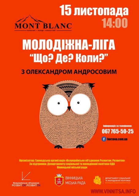 15 листопада у ресторані «Mont Blanc» телевізійний ведучий Олександр Андросов проведе змагання інтелектуалів з гри «Що? Де?Коли?». В цей день організатор проектів Ірина Борзова підготовила для вінничан дві гри: о 14.00 відбудуться змагання серед молоді в рамках гри «Молодіжна ліга», а в 18.00 за звання найрозумніших позмагаються команди з бізнес сектору, політичних структур та громадських об’єднань в рамках гри «Бізнес Ліга»! Реєстрація команд розпочалась та триватиме до 7 листопада. Детальна інформація за тел. 067-765-50-25.