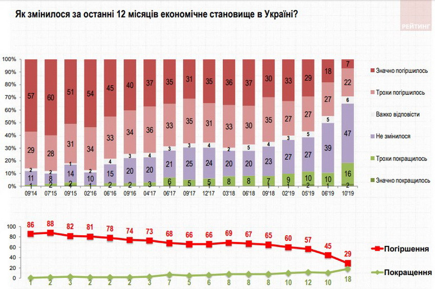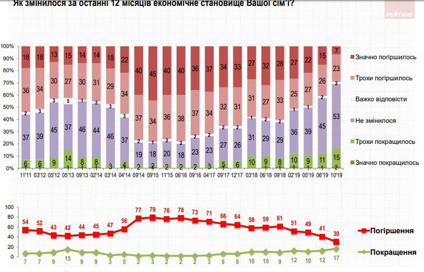 У динаміці з початку року, кількість тих, хто негативно оцінював економічну ситуацію як у країні, так і у родині, зменшилася удвічі. Так, 18% опитаних вважають, що за останні 12 місяців економічне становище в країні покращилася, 47% говорять, що воно не змінилося, і 29% – стверджують, що ситуація погіршилася. Подібні оцінки і щодо фінансового становища сімей: 17% – вважають, що ситуація покращилася, 53% – не побачили зрушень і 30% – сказали про погіршення.