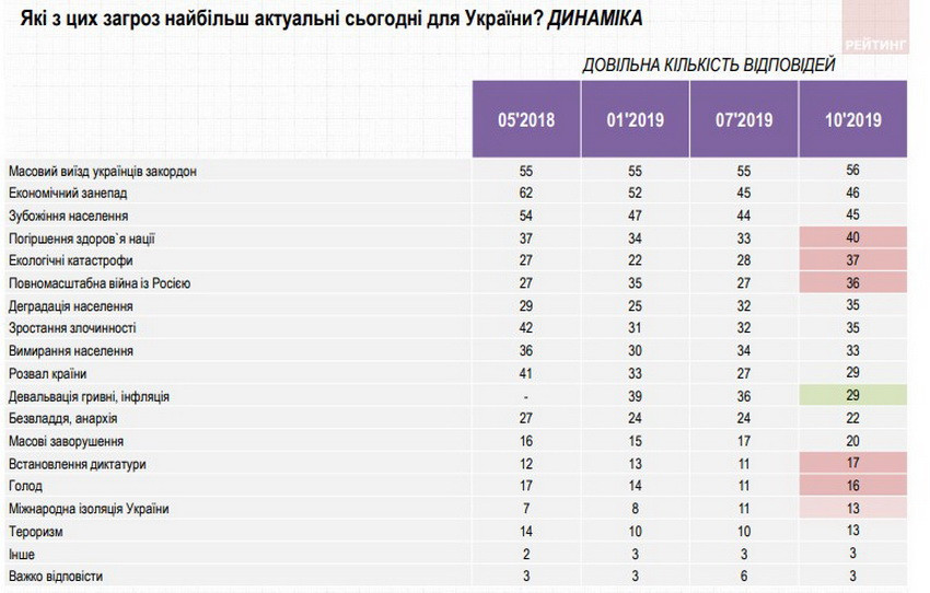 Найбільшою загрозою для України сьогодні респонденти вважають масовий виїзд українців закордон (56%). Близько 45% загрозами вважають економічний занепад та зубожіння населення. Від 30% до 40% вважають загрозами погіршення здоров’я нації, екологічні катастрофи, повномасштабну війнуРосією, зростання злочинності, деградацію та вимирання населення. Від 20% до 30% – розвал країни, девальвацію гривні, безвладдя та масові заворушення. Від 13% до 17% загрозами вважають встановлення диктатури, голод, міжнародну ізоляцію України та тероризм. За останні три місяці відчутно зросла актуальність таких загроз як погіршення здоров’я нації, екологічних катастроф, війни з Росією. Натомість знизилась загроза девальвації гривні, інфляції.