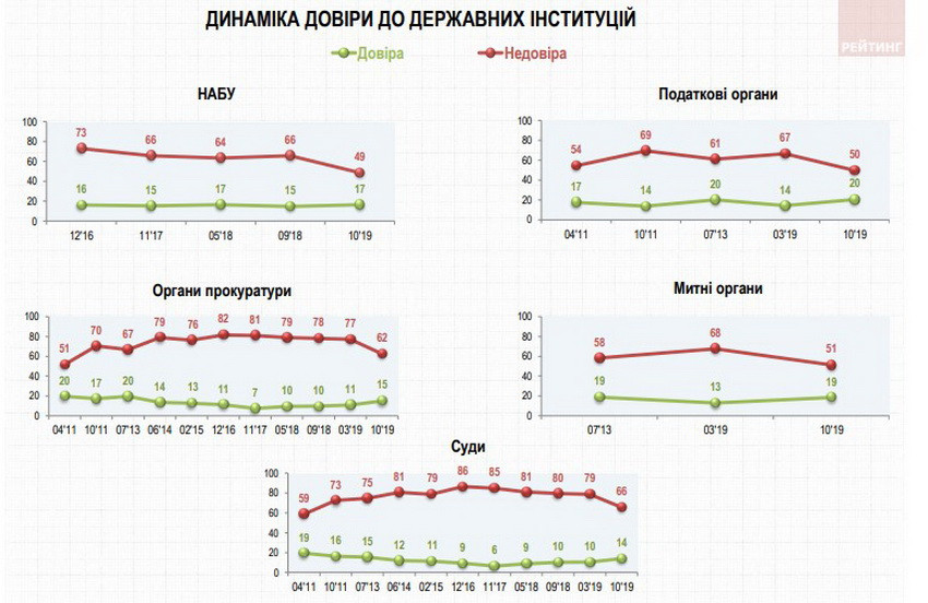 Іншим інституціям швидше не довіряють, аніж довіряють. Так, поліції не довіряють 49%, довіряють – 31%, прикордонній службі – 41% та 23% відповідно, Державному бюро розслідувань – 41% та 23%, податковим органам – 50% та 20%, митним органам – 51% та 19%, НАБУ – 49% та 17%, Національному агентству з питань запобігання корупції – 48% та 15%.