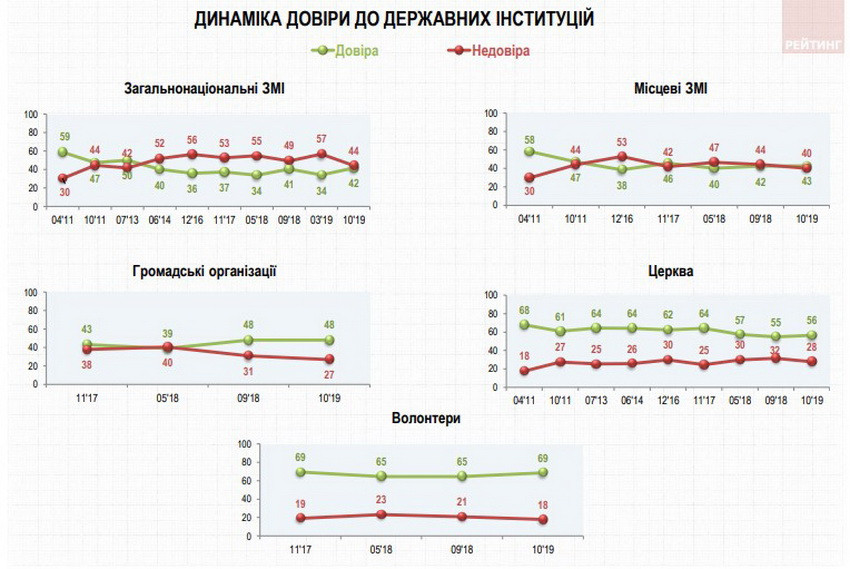 Найбільше сьогодні довіряють волонтерам (69%), ветеранам АТО (67%), Президенту України (66%) та армії (65%). Також високий рівень довіри має церква (56%).
