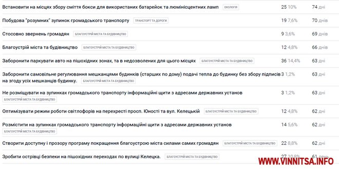 Більшість з них стосуються благоустрою та будівництва, а також транспорту.