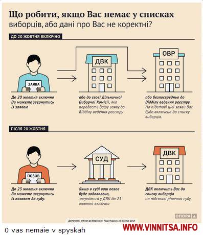 Не пізніше як за 5 днів до дня виборів (до 20 жовтня 2014 р. включно) необхідно подати заяву про включення до реєстру виборців до дільничної виборчої комісії (ДВК) або до відділу ведення Державного реєстру виборців за місцем своєї реєстрації.