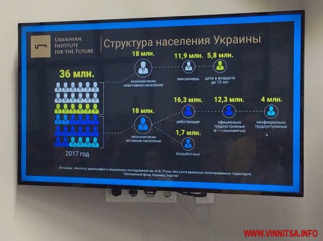 Під час презентації, експерти продемонстрували інфоргафіку, прогноз чисельності економічно активного населення України до 2048 року: 2016 рік - 18млн; 2024 рік - 16,8млн.; 2032 рік - 16,5 млн., 2040 рік - 14.5 млн. і 2048 рік - 13 млн. І на прикладі 2017 року показали зайнятість 36 мільйонного населення України. Лише половина людей є економічно активними.