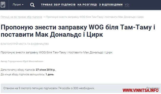 Чи не найчастішою петицією до очільників Луцька є відкриття у місті McDonald’s. Таких звернень уже три. Городяни навіть пропонують знести автозаправку, а на її місці спорудили філіал мережі швидкого харчування. Зазначимо, що «МакДак» став найпопулярнішим місцем зустрічі вінничан. Таких закладів у місті – два.