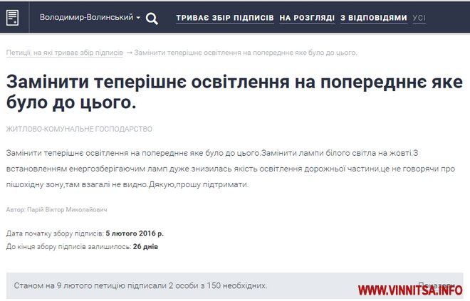 Поки Вінниця активно впроваджує енергозберігаючі технології, волиняни вимагають керівництво зняти встановлення ощадні лампи денного світла на ліхтарях і змінити їх на «жовті». Бо, за їх твердженням, з енергозберігаючими нічого не видно.
