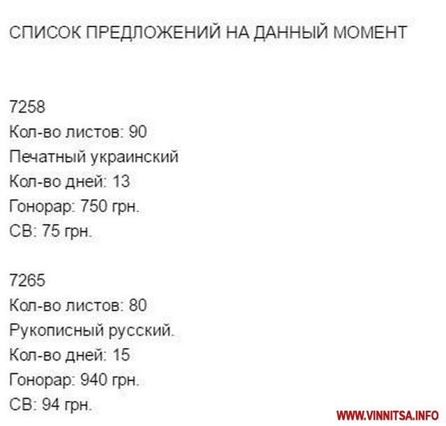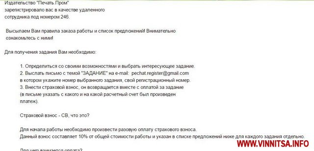 Просте до виконання завдання для студентів знайшов у оголошеннях 16-ти річний вінничанин Євгеній. У так званому видавництві «Печать Пром». Його попросили набирати скановані тексти з книжки. Робота забирає трохи часу, проте гарантовано мала принести заробіток, але не склалося. Замість зарплати Євгена змусили ще й перерахувати його власні кошти на організацію-замовника.