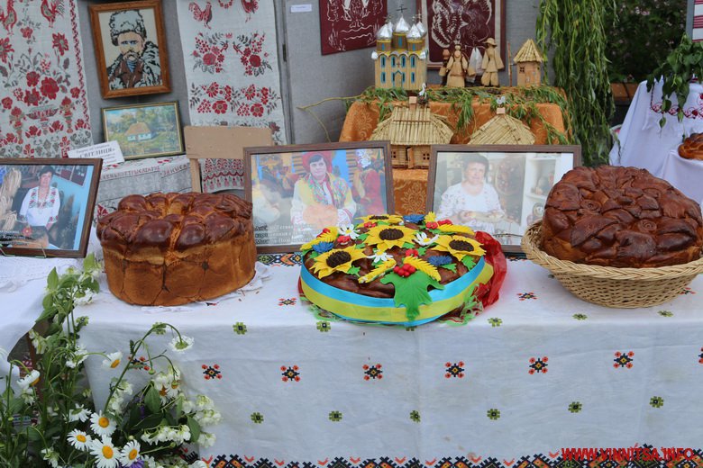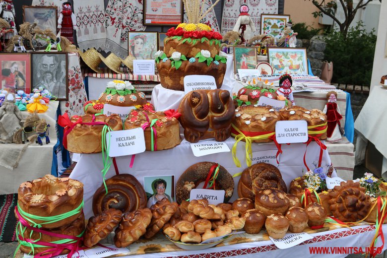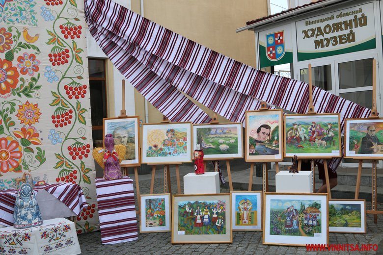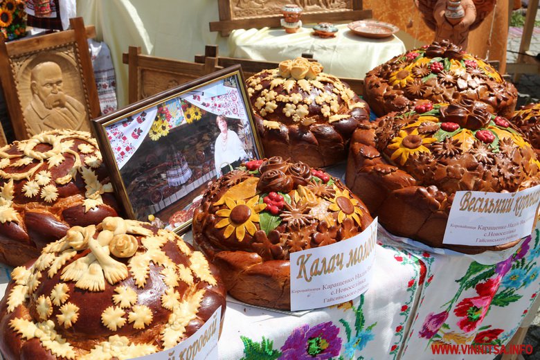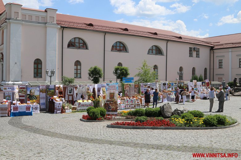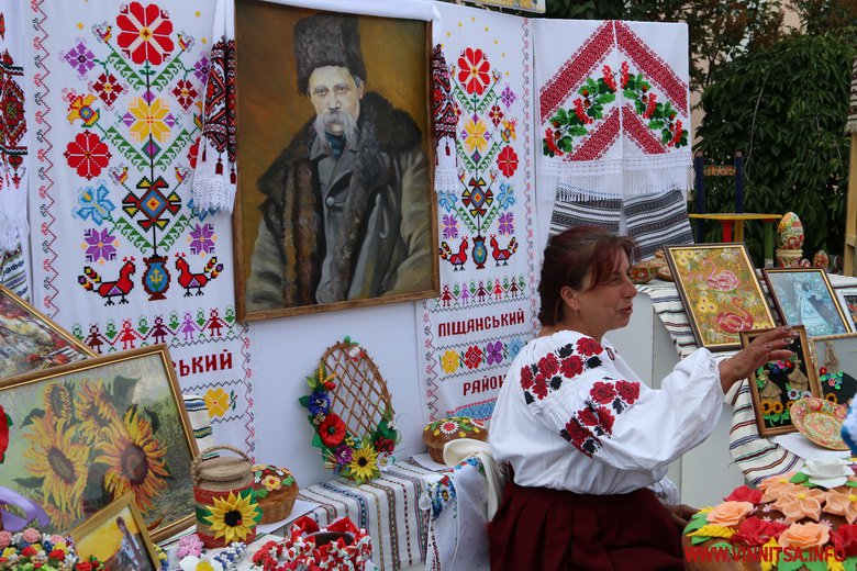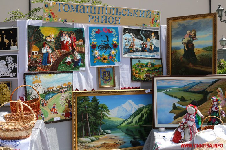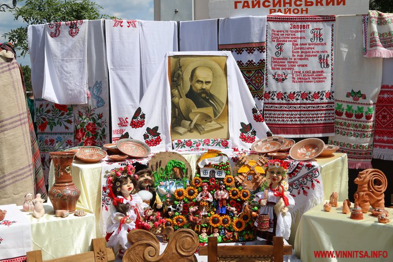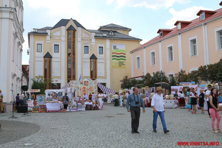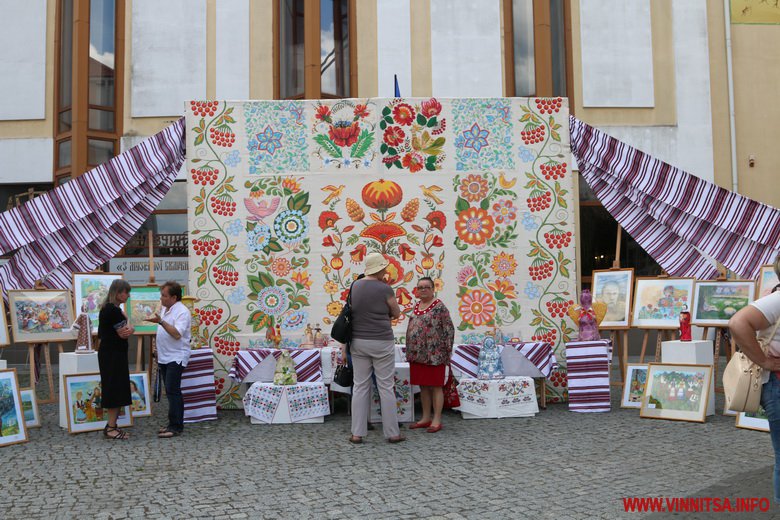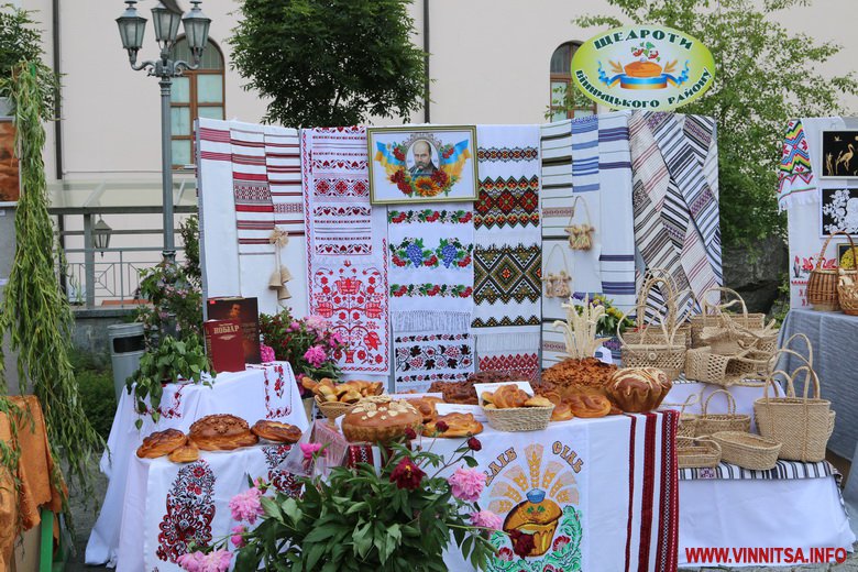 У центрі міста розгорнули колоритний фестиваль. Представники різних районів Вінницької області презентують величезну кількість короваїв, вишитих рушників, ляльок-мотанок, виробів з дерева і соломи, картини.