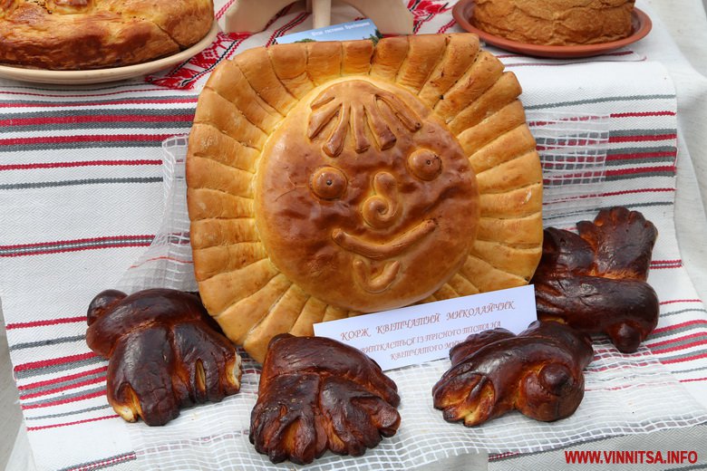 «Сьогодні ми привезли на виставку старовинні домоткані рушники, яким близько 100 років, вироби з соломи, картини вихованців школи естетичного виховання нашого району, ляльки-мотанки. І, звичайно, обрядові хліби, а саме: обжинковий, який вручався хліборобам, після того, як закінчилися жнива. Весільний є коровий, який ставиться на стіл перед молодятами, серединка вирізається і дається молодятам, решта роздається людям, є калачі для старостів і нанашок. Спекли ми і привезли ще голубів для молодят - давали їх на наступний день після весілля. Шишки - це невеличкі булочки, які вручалися на дівич-вечір, жайворонки пекли на 40 Святих і роздавалися між дітками, вони їх підкидали в гору і так закликали пташок, призивали весну. Є ще великодні паски, калита, яку пекли на Андрія і прикрашали маком. Є також калачі на хрестини», - розповідає Мая Ковінчук.