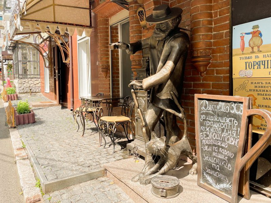 Цей котик увічнений у скульптурі, що розташована перед музеєм-кав’ярнею «Панъ Заваркінъ та синъ». На ньому Шльома краде сосиску у місцевого мешканця, поки той попиває каву. А поруч стоїть бляшанка з написом «подайте котику», і туристи регулярно кидають туди донати «на корм Шльомі».