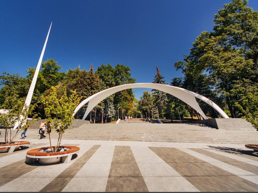 Цю білосніжну арку з чотирма опорами, а також шпиль біля неї, спорудили у 1967 році за проєктом Романа Мархеля та Владислава Горбатого. Вважається, що композиція символізує політ людини у космос: сама арка – це Земля, а шпиль біля неї – космічна ракета.