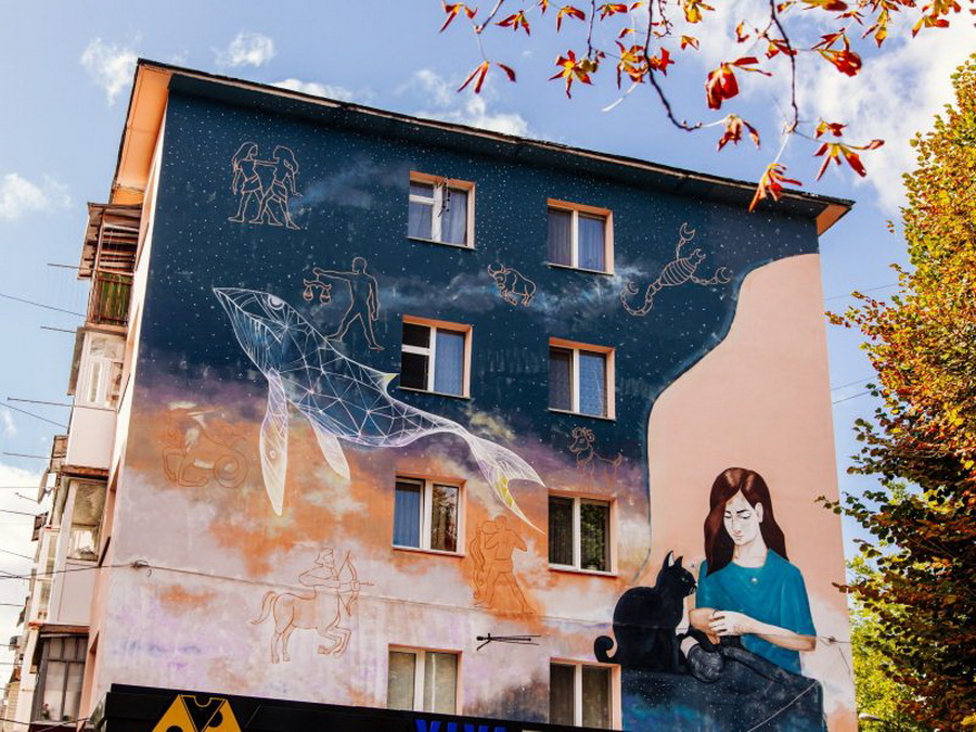 Його більшу частину займає космічний простір зі знаками зодіаку та великим сузір’ям кита. А у правому нижньому куті зображена замріяна дівчина зі своїм домашнім улюбленцем котиком.