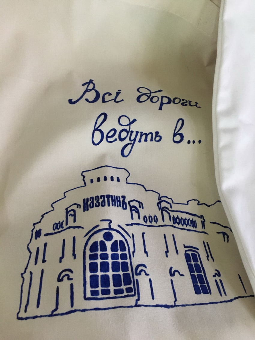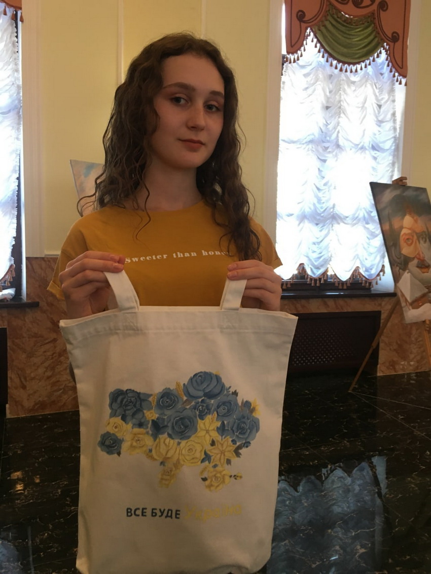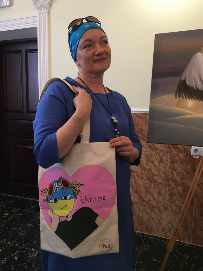 «Ми сиділи в підвалі три тижні. Не було зв’язку кілька днів. Одного дня вийшла зі сховища– лячно небо червоне від зривів ракет і снарядів, гримить, все трясеться. Нам допомогли виїхати добрі люди. Ми їхали із жінкою, яка віддавала папуг подрузі в Козятині і так ми тут опинилися. Тут на Вінниччині нам дуже допомогли: дали будинок безкоштовно, необхідні речі. Я поволі прийшла в себе і відновила малювання. На шопері я зобразила– 3- D українське серце. Участь у проекті цікава адже моя робота піде на користь ЗСУ, і іншим людям».