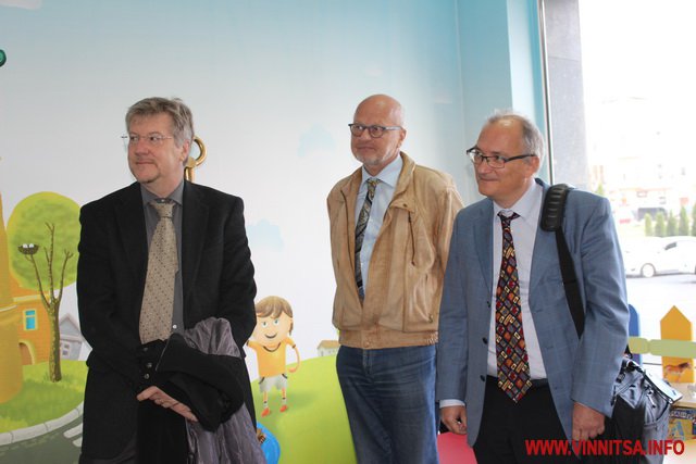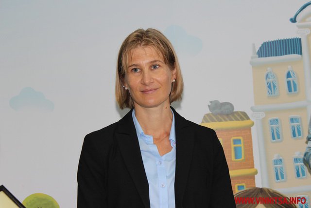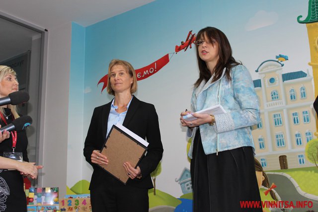 «Вінниця вже досить довго являється нашим надійним партнером. Рік назад ми дізналися, що ви відкрили кімнати для дітей. В цій кімнаті ви даєте можливість дітям залишитися поки їхні батьки зайняті справами та курсують по Прозорому офісу, щоб отримати послуги, за якими вони прийшли. Це перше українське місто, яке отримало європейську енергетичну відзнаку. Ми подумали, що батьки залишивши своїх дітей в такому безпечному і приємному приміщенні під наглядом, практично зможуть використати свій час, для того щоб, наприклад, детальніше дізнатися про енергоефективність, вивчити інформаційну листівку чи бюлетень. Таким чином, ця кімната, не прямо, але опосередковано допомагає людям дізнатися більше про енергоефективність. В рамках енергоефективності ми подумали, що було б дуже добре відзначити Вінницьку міську раду за цей інноваційний проект, це те що ви в рамках гендерної рівності теж просуваєте ідеї енергоефективності, тому ми підготували для вас подарунок. В кімнаті було вже багато іграшок, але ми вирішили теж долучитися до процесу, адже дітям ніколи іграшок багато не буває. Ми вибирали іграшки, які були зроблені з дерева, тому ще поновлювані ресурси і дуже дружні до навколишнього середовища»,- каже Петра Відмер.