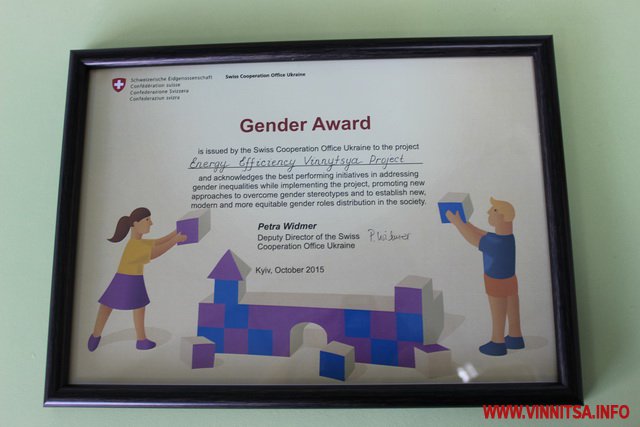 Наприкінці минулого року Швейцарське Бюро Співробітництва в Україні запровадило новий інструмент для заохочення впровадження гендерних підходів, а саме, «Гендерну нагороду». Її вручають тим, хто демонструє оригінальні та креативні підходи, спрямовані на виявлення та усунення проявів гендерної дискримінації. А також – сприяють забезпеченню рівних прав і можливостей в повсякденному житті. Сьогодні таку нагороду вручили Вінницькій міській раді.