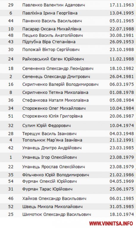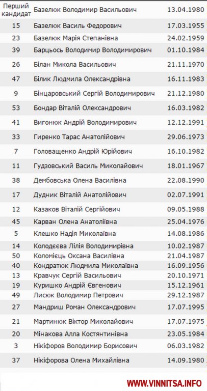 Списки «Свободи» до Вінницької міської ради (округ, П.І.П., дата народення)