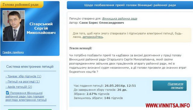 «Чи потрібно позбавити премії та надбавки за високі досягнення у праці голову Вінницької районної ради Сітарського Сергія Миколайовича, який своїми розпорядженнями звільнив двох працівників апарату районної ради, які в подальшому визнанні судом незаконними, а дії голови призвели до значних втрат бюджетних коштів?», - зазначено в зареєстрованому зверненні.