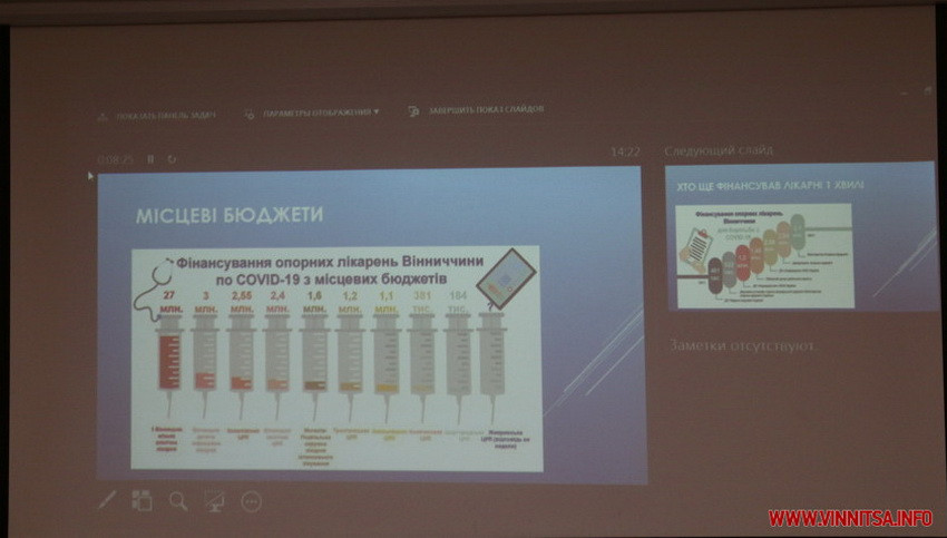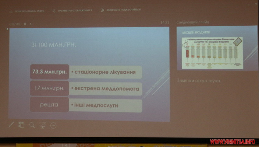 «Тут не тільки опорні лікарні, які лікували стаціонарно, тут також є центри первинної медико-санітарної допомоги, і екстрена медична допомога, мобільні бригади. Загалом зі 100 мільйонів виділених коштів на стаціонарне лікування було виділено 73,3 мільйони гривень. Як можна бачити, левова доля від загальної суми пішла якраз на лікування стаціонарних хворих. Оскільки зрозуміло, що матеріальна база була застаріла, апаратів ШВЛ майже не було в робочому стані стільки, скільки було треба.