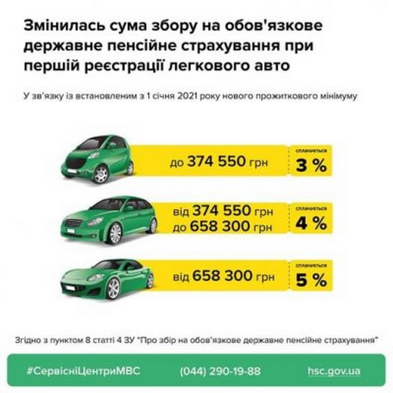 У зв’язку зі встановленням з 1 січня 2021 року прожиткового мінімуму для працездатних осіб у розмірі 2270 грн, змінено розміри ставок збору на обов’язкове державне пенсійне страхування при першій реєстрації легкових автомобілів.