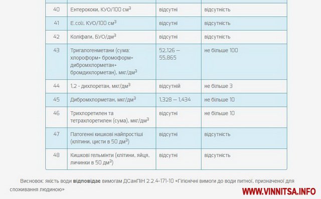 За коментарем щодо якості води Вiнниця.info звернулася до лабораторії «Вінницяводоканалу», які забезпечують місто центральним водопостачанням. На офіційному сайті в рубриці «якість води» за січень виставлені результати досліджень. По 48 показникам висновок такий: «Якість води відповідає вимогам ДСанПіН 2.2.4-171-10 «Гігієнічні вимоги до води питної, призначеної для споживання людиною».